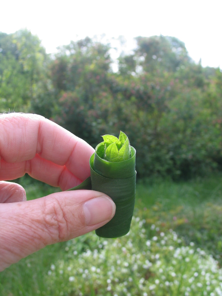 Diese Technik eignet sich auch bestens für Brennnesseln. Einfach ein nicht brennendes Blatt aussuchen (Bärlauch, Knoblauchrauke, entdornte Brombeerblätter … ) um ein schönes Brennnesselblatt wickeln und zusammenrollen.