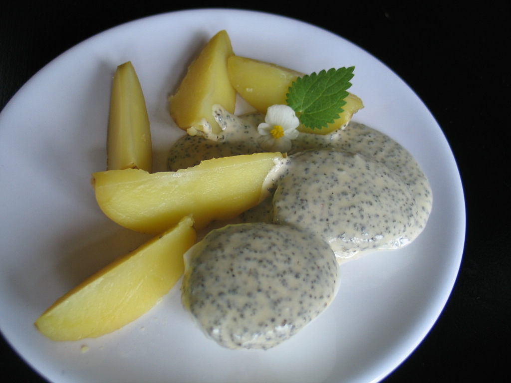 Wie gewohnt Kartoffeln und Eier kochen und die Senfsoße zubereiten. Zum Schluss den Brennnesselkaviar dazugeben.
